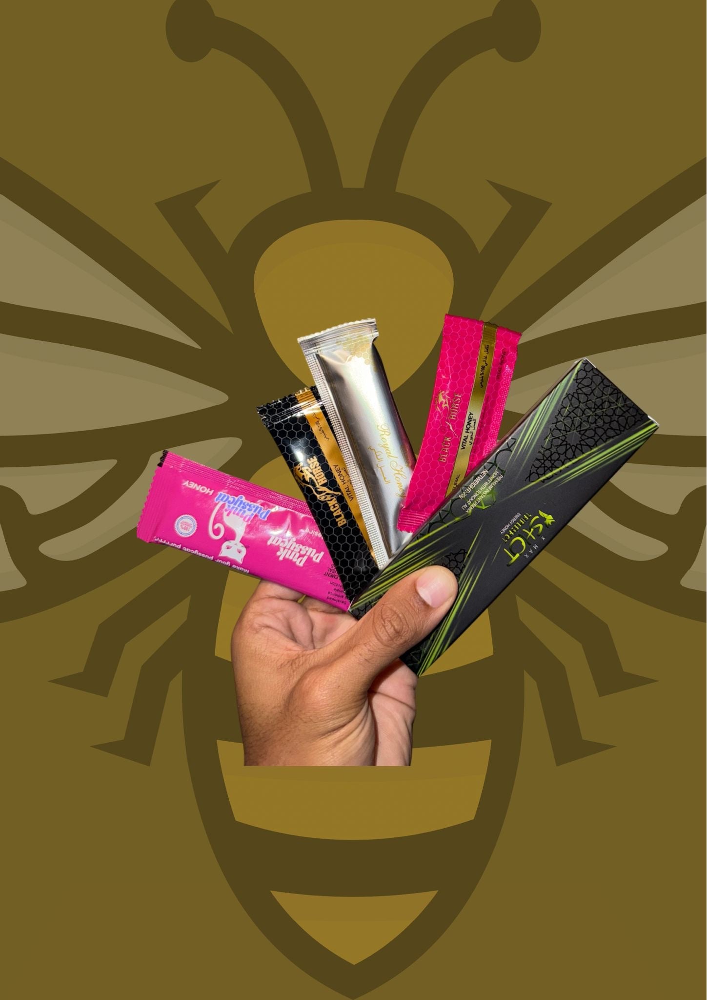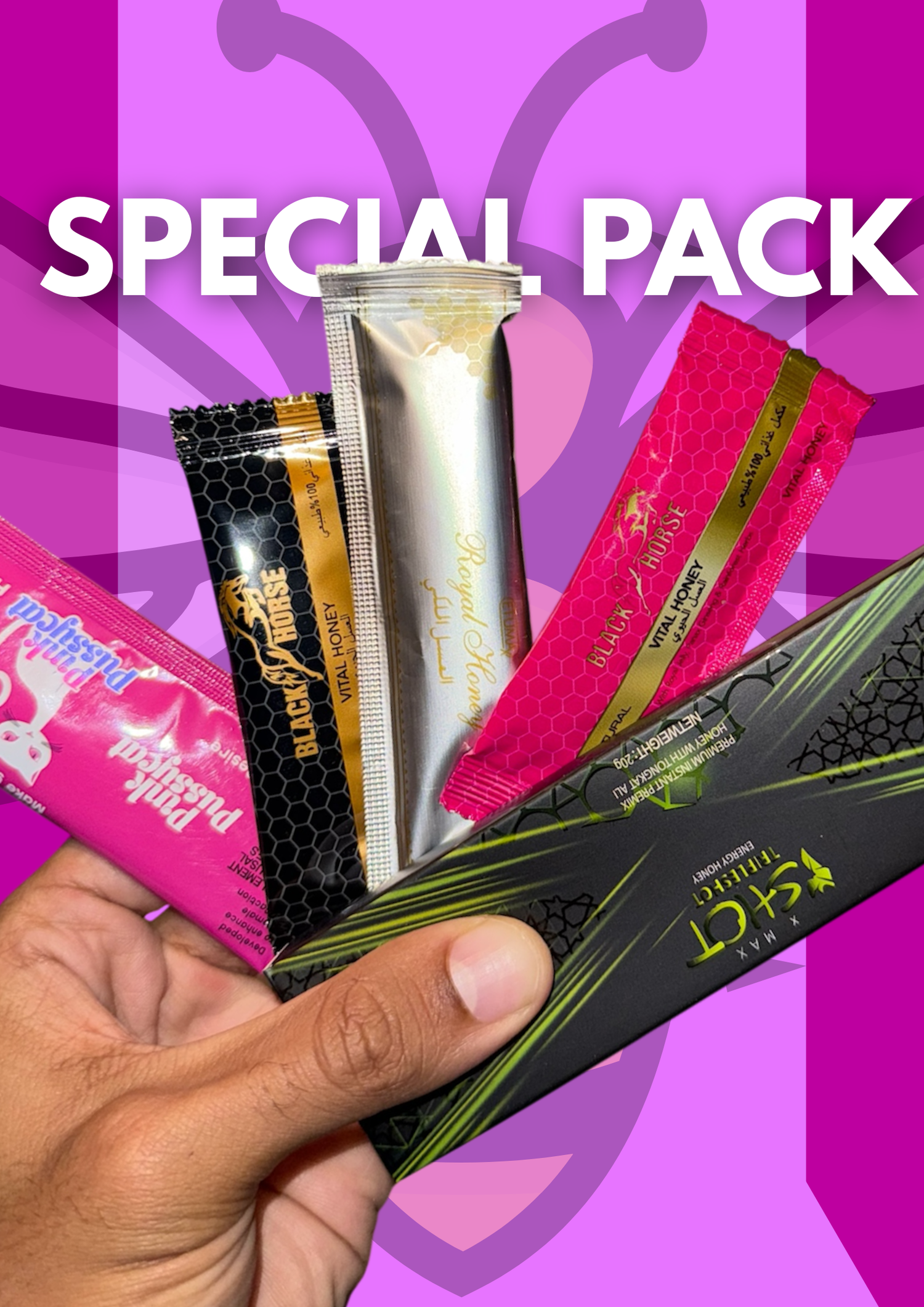 Onze ''SPECIAL PACK" bevatten 5 soorten packs. Pink Pussycat, Black Horse, Royal `honey klassiker, Black Horse vrouwelijk en X-SHOT